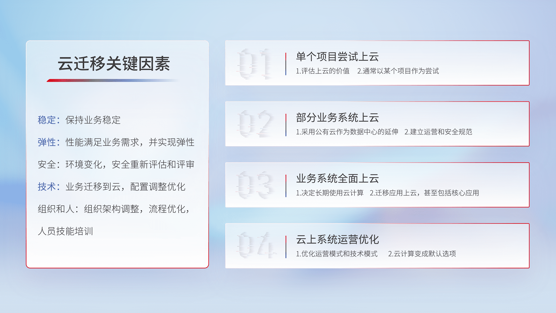结合实际业务,,,从规划设计、、、、云平台选型、、云原生改造、、、数据迁移、、集成交付,,,,迁移全过程为客户识别最佳上云路径,,,,做好风险识别管理,,,设计网络架构、、身份权限、、安全审计合规、、操作审计、、、日志审计、、监控告警策略、、、、多站点容灾设计等,,,对云上基础设施进行整体规划,,提升IT治理水平,,,,以满足弹性、、、、高可用、、高性能的需求。。