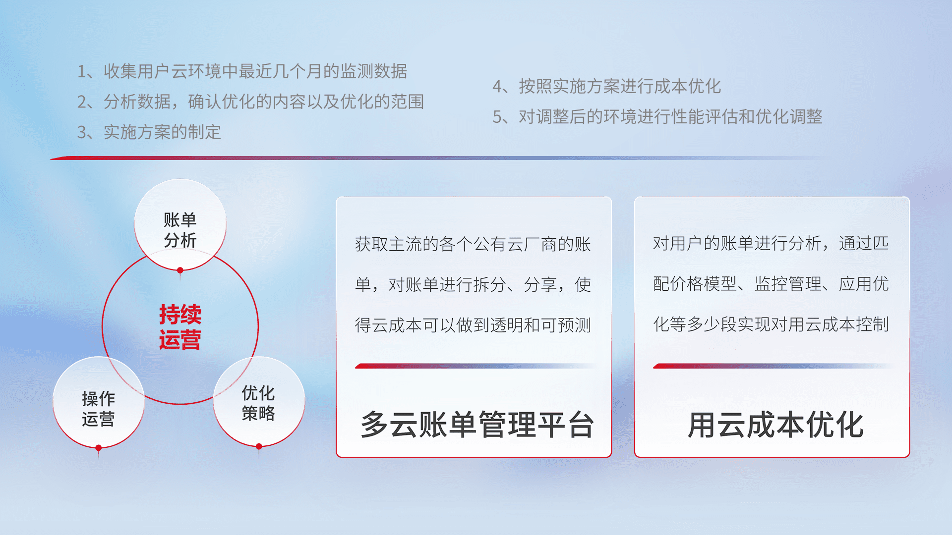 通过多云纳管,,,,以统一的资源数据模型把客户的云资源进行抽象和封装,,,,进而实现对多云资源的统一操作,,,,保障云资源管理的可靠性、、、、稳定性与可用性。。量身定制化运维内容,,配置、、、、开发运维、、、补丁管理、、备份、、、、监控、、、认证和访问管理、、、、审计和日常巡检等,,,,保障在用云过程中的可靠度,,稳定度以及高可用率。。。
