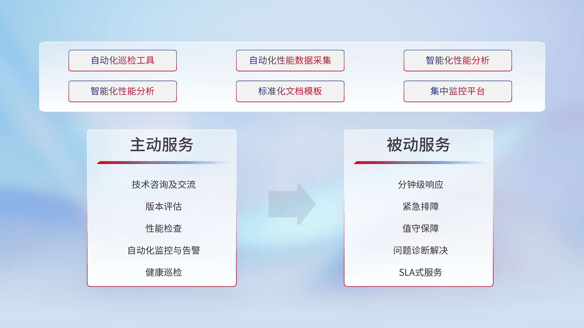 智能化工具和标准化文档,,,保障服务质量,,,提供主动服务(包含技术咨询、、、版本评估、、、、性能检查、、、自动化监控与告警、、健康巡检)和被动服务包含(分钟级响应、、、紧急排障、、、、值守保障、、问题诊断解决、、、SLA服务)。。